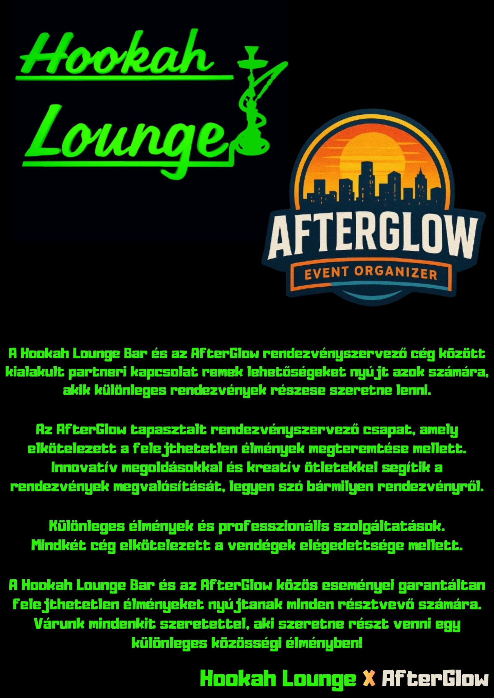 Partneri Kapcsolat a Hookah Lounge Bar és az AfterGlow rendezvényszervező cég között.